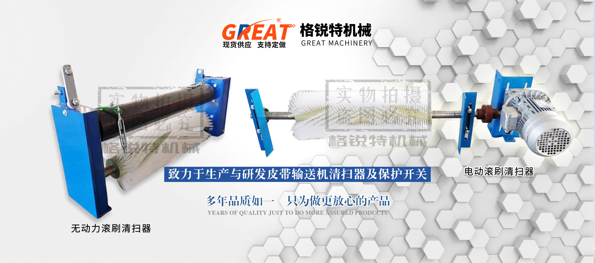 衡水格銳特機械科技有限公司常年致力于生產與研發皮帶輸送機清掃器及保護開關,其中主營聚氨酯清掃器,合金清掃器,電動滾刷清掃器,機械式滾刷清掃器,緩沖床,緩沖條,雙向拉繩開關,兩級跑偏開關,打滑檢測器,料流檢測器等保護開關,常年銷往各大水泥廠,煤礦廠,電廠,輸送機廠家,質量優越,價格實惠,望各大領導及同行來廠參觀指導,期待您的光臨!!!